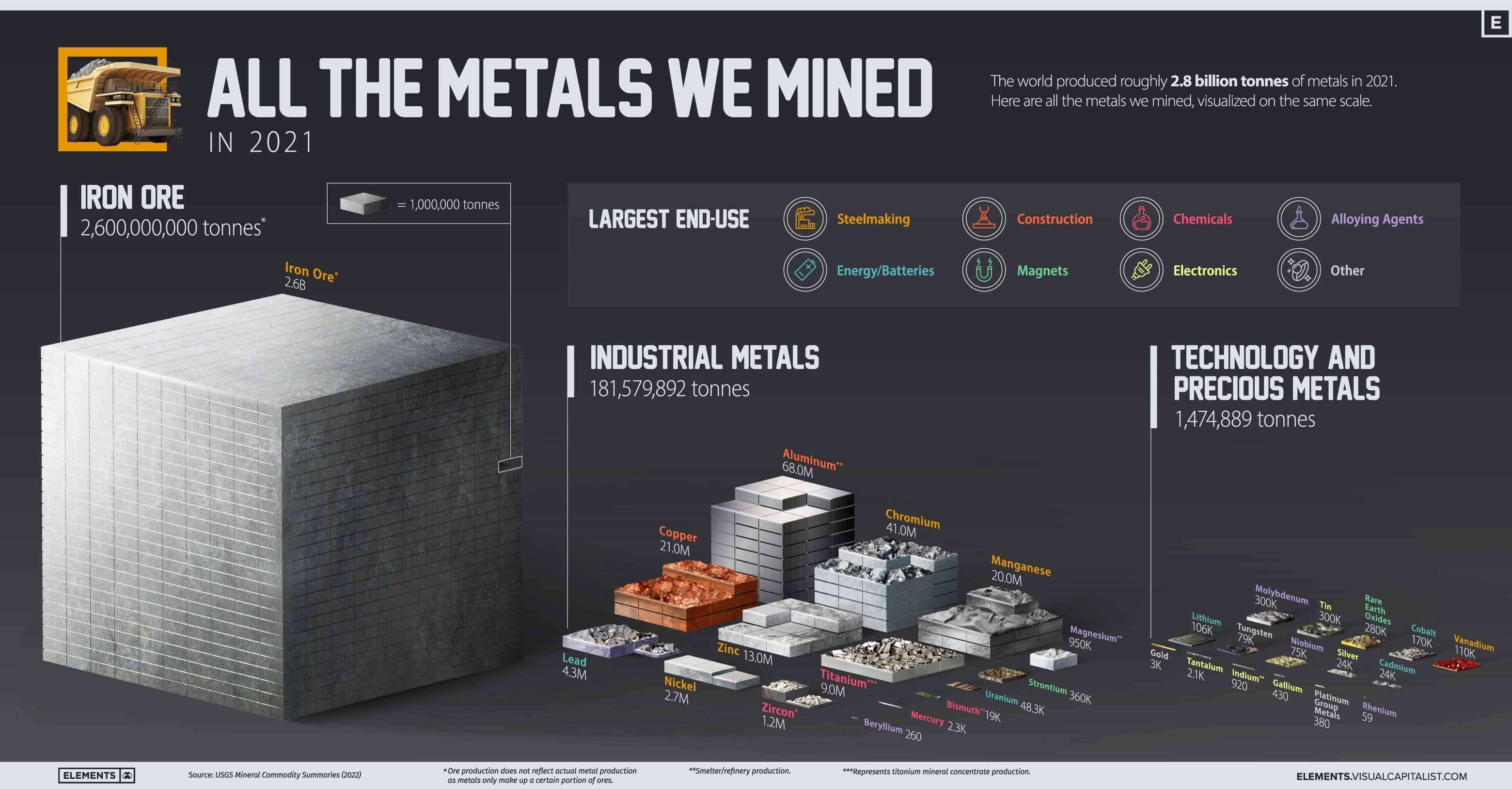 Los metales industriales se utilizan principalmente en la fabricación de acero, la construcción, la fabricación de productos químicos y como agentes de aleación. En 2021, el mundo extrajo más de 181 millones de toneladas de estos metales.